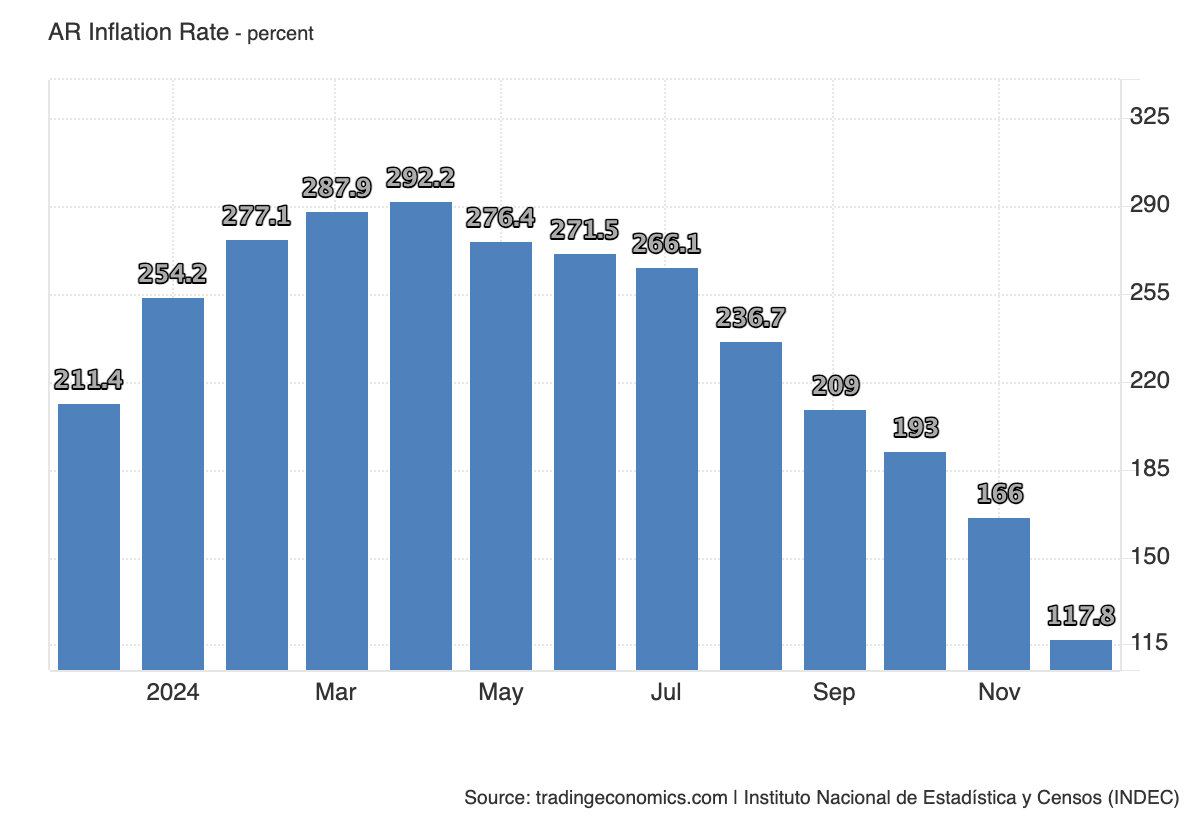 One of Milei's most notable achievements has been controlling inflation, which dropped from over 200% to 117.8% by the end of 2024.