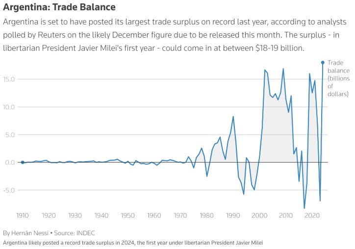 This has improved the banks' operating environments, enhancing their profitability and market appeal. Additionally, his focus on boosting grain and energy exports resulted in Argentina recording its largest-ever trade surplus, estimated at $18–19 billion in 2024.