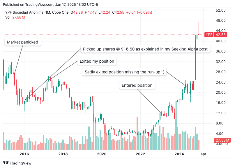 Case in point, when YPF shares dropped from $30 to $16 in 2016, I picked up shares based on the rationale in this article I published in Seeking Alpha. Then sold them at $25 in early 2017. I bought YPF shares again in mid-2023 at $14, only to sell them in mid-2024 at $21, missing the run-up to above $40.
