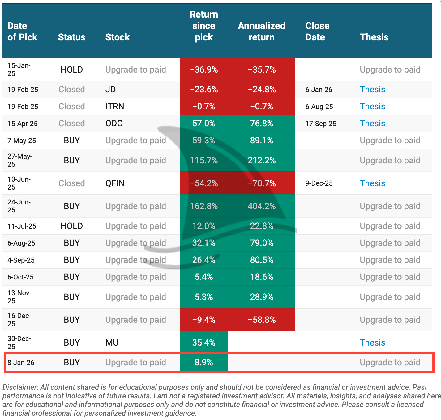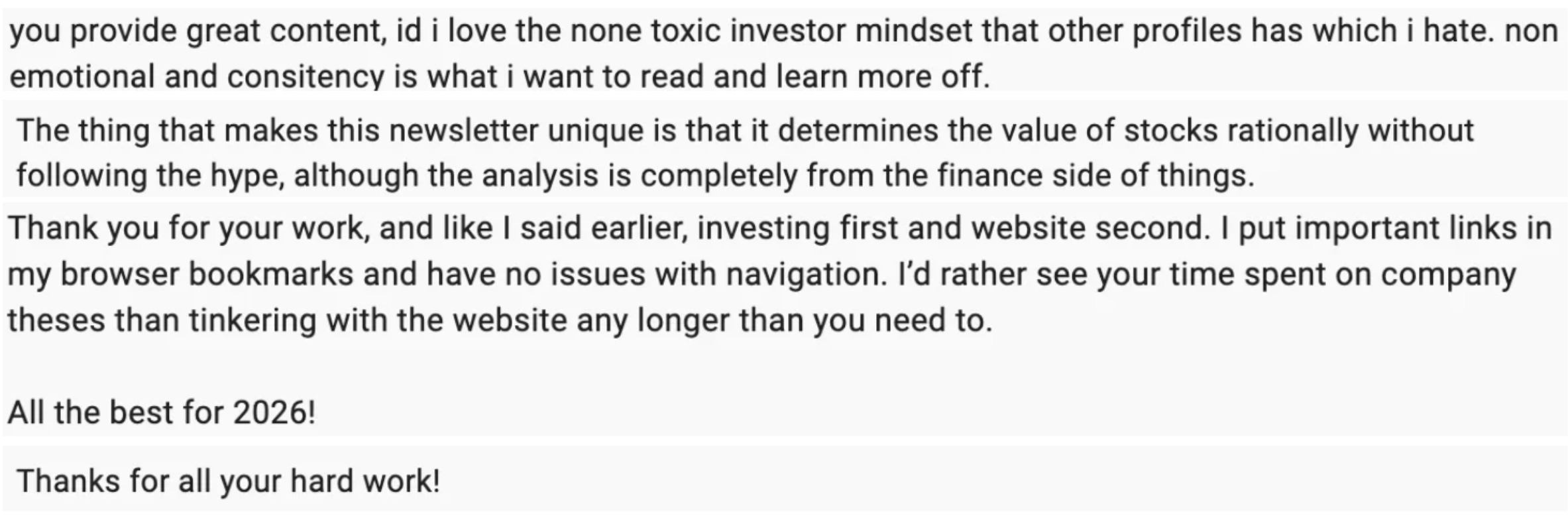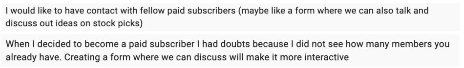 Most of you find all the content for free subscribers useful (especially the stock ideas and company updates). Some of you couldn’t find the weeklies and performance.