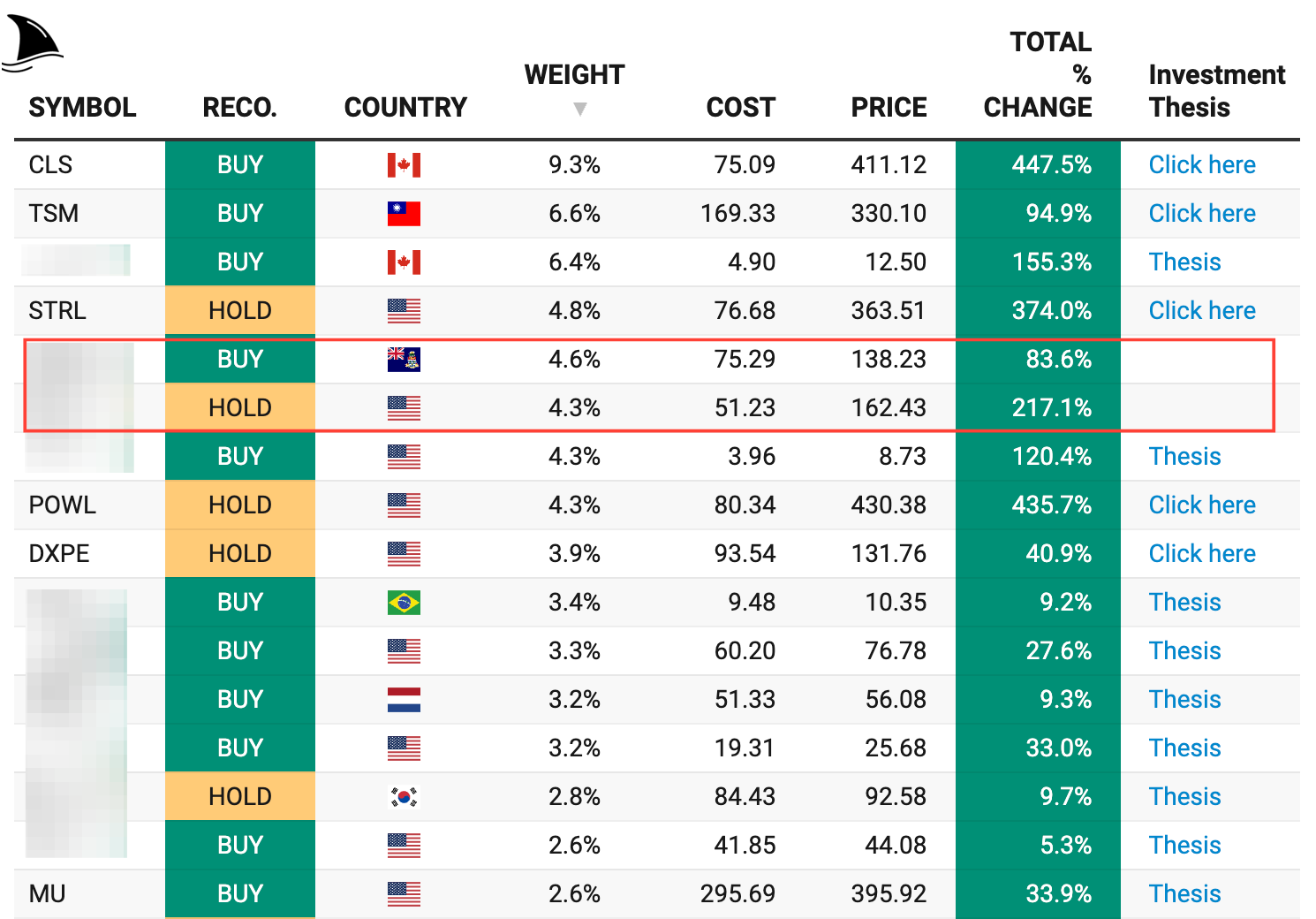 The second addition is a clickable column that will take you to the thesis and everything I have written about the stock.