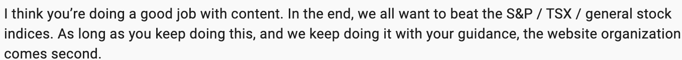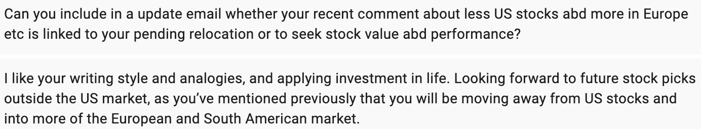 In the future, I may migrate to Wordpress but not yet. Maintaining a website is time-consuming, and Substack, while frustrating, does most of the back office for me so I can focus on my competitive advantage (analyzing stocks) rather than on website design. Actually, people agree with that decision.