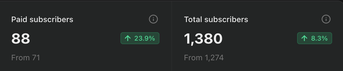 Currently, the newsletter has 88 paid members and a total of 1,380 subscribers.