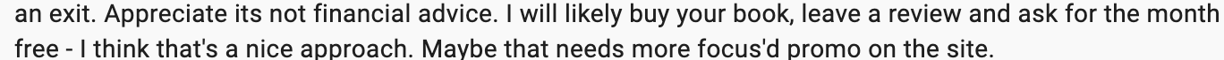 Maybe I have not promoted the book the proper way. But if you leave a review on Amazon, I will give you a 1-month access to the premium.