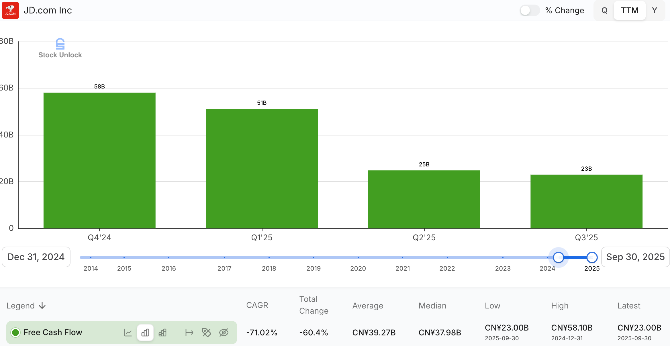 It’s disheartening to see earnings and cash that could have been mine as a shareholder instead being siphoned into a subsidy battle. JD’s free cash flow, while still positive, is being squeezed. On a trailing 12-month basis it was down from RMB 58B in Q4 2024 to RMB 23B in Q3 2025.