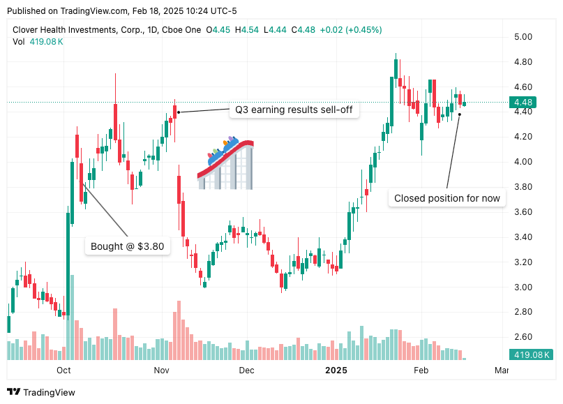 I am closing my position in Clover Health (CLOV 0.00%↑) due to the increased risk of a post-earnings selloff, similar to what occurred after Q3 results. I initially bought shares on October 7 at $3.80, and with the stock now up just 17.8% over 134 days (an annualized return of 56%), I see limited upside in holding through potential short-term volatility. While the company has delivered strong Medicare Advantage growth and macro tailwinds, such as higher reimbursement rates and regulatory changes, the 40% year-to-date rally and 60% retail ownership make profit-taking a real concern.