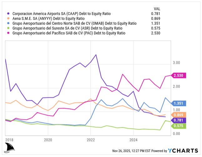 On leverage and risk, CAAP looks conservative at first glance. Its debt-to-equity ratio is about 0.78x, lighter than OMAB at 1.35x and PAC at 2.53x, and roughly in line with Aena at 0.87x. ASR is the most conservative at 0.58x.