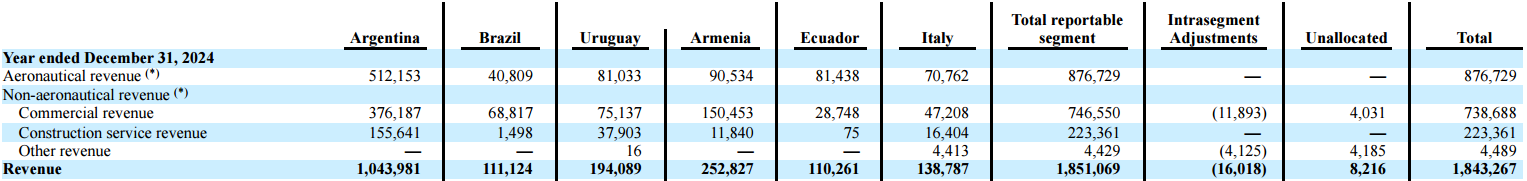In 2024, CAAP had $1.84 billion in total revenue. Argentina generated 56% of the revenue followed by Armenia (14%), Uruguay (10%), Italy (7.5%), Brazil (6%), and Ecuador (6%).