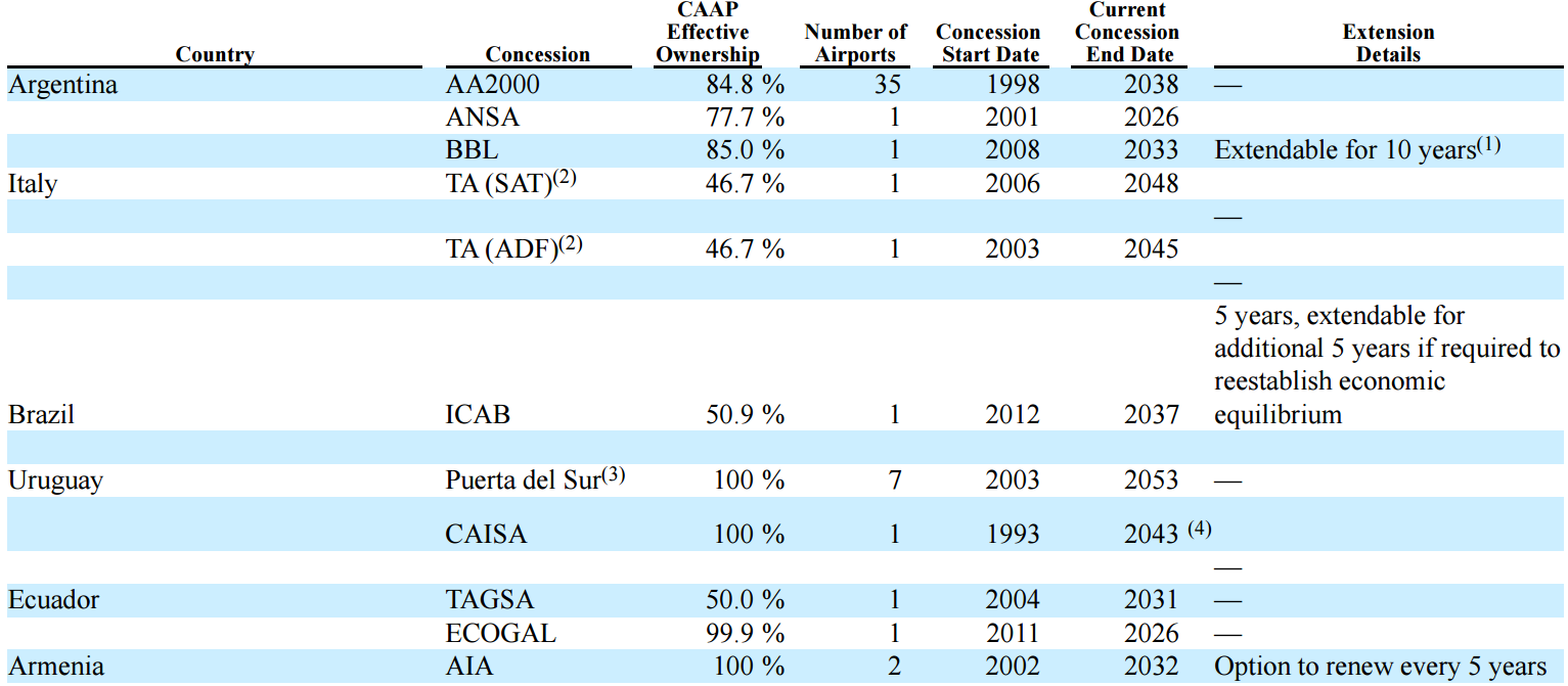 CAAP is a huge Argentina-focused airport operator (37 airports in Argentina, 8 in Uruguay, 1 in Brazil and 2 in each of Italy, Armenia and Ecuador).