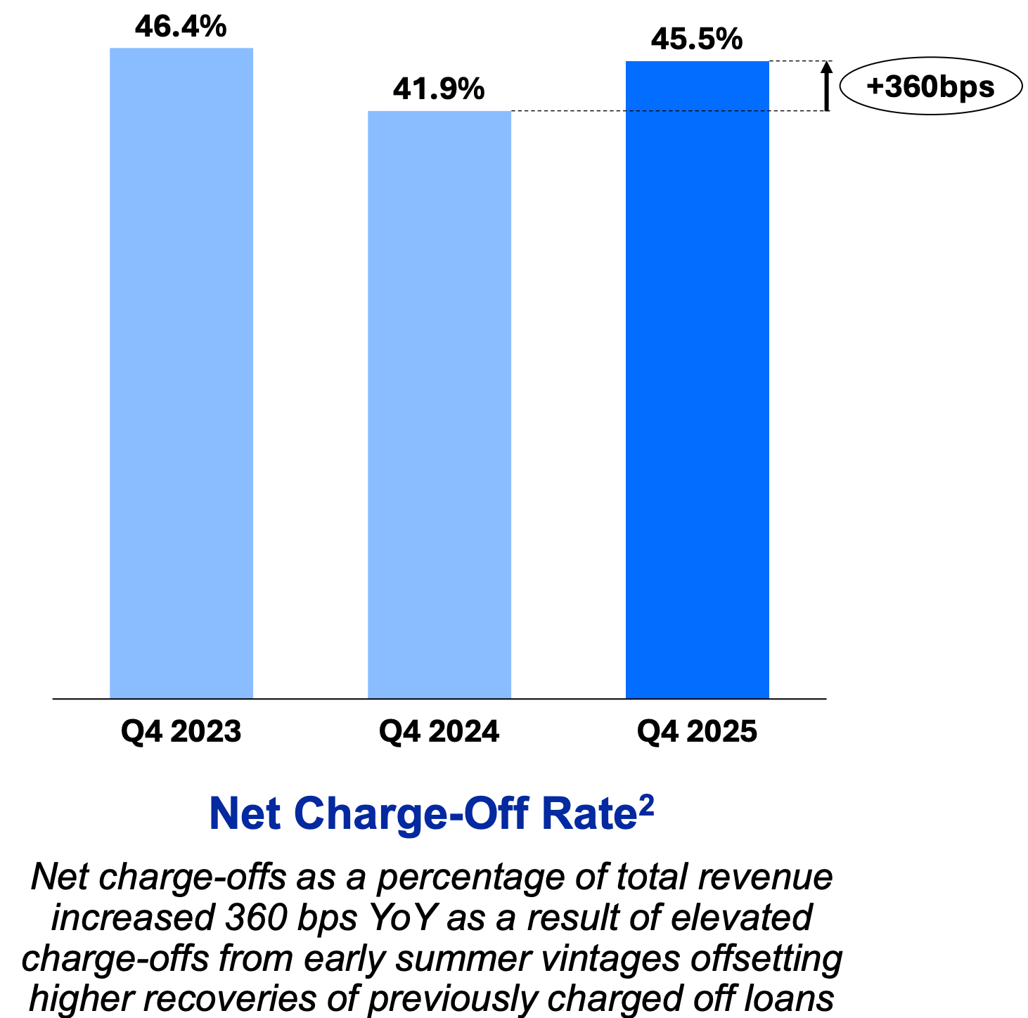 The credit side of the ledger shows growing pains. Net charge-offs as a percentage of revenue rose to 45% from 42% year over year.