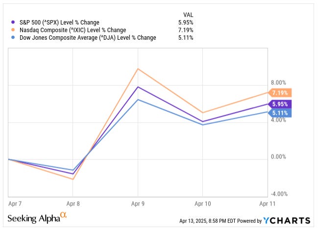 I think last week was one of the most volatile weeks I have experienced in my investment life. A single day last Tuesday saw the S&P 500 up 3.8% at midday due to a post by Walter Bloomberg that said “HASSETT: TRUMP IS CONSIDERING A 90-DAY PAUSE IN TARIFFS FOR ALL COUNTRIES EXCEPT CHINA”. But the market crashed to close 1.6% in the red as Trump denied the post.