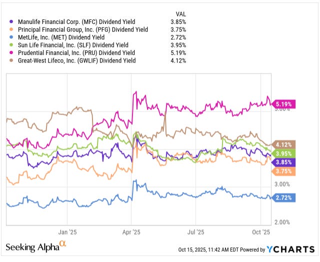The dividend yield tells a similar story. Manulife pays in line with peers: Principal, Sun Life, and Great-West roughly 4%. Only Prudential’s 5.2% stands out as materially higher, but it carries more exposure to U.S. annuities. And MET is lower at 2.7%.