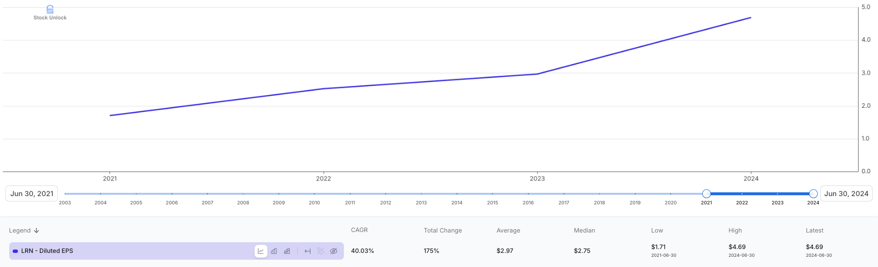 Despite ~49% YTD stock gains, Stride stock still trades at 13x EBITDA and 22x trailing earnings — a reasonable valuation for a company that has grown EPS 62% annually for the past 5 years.