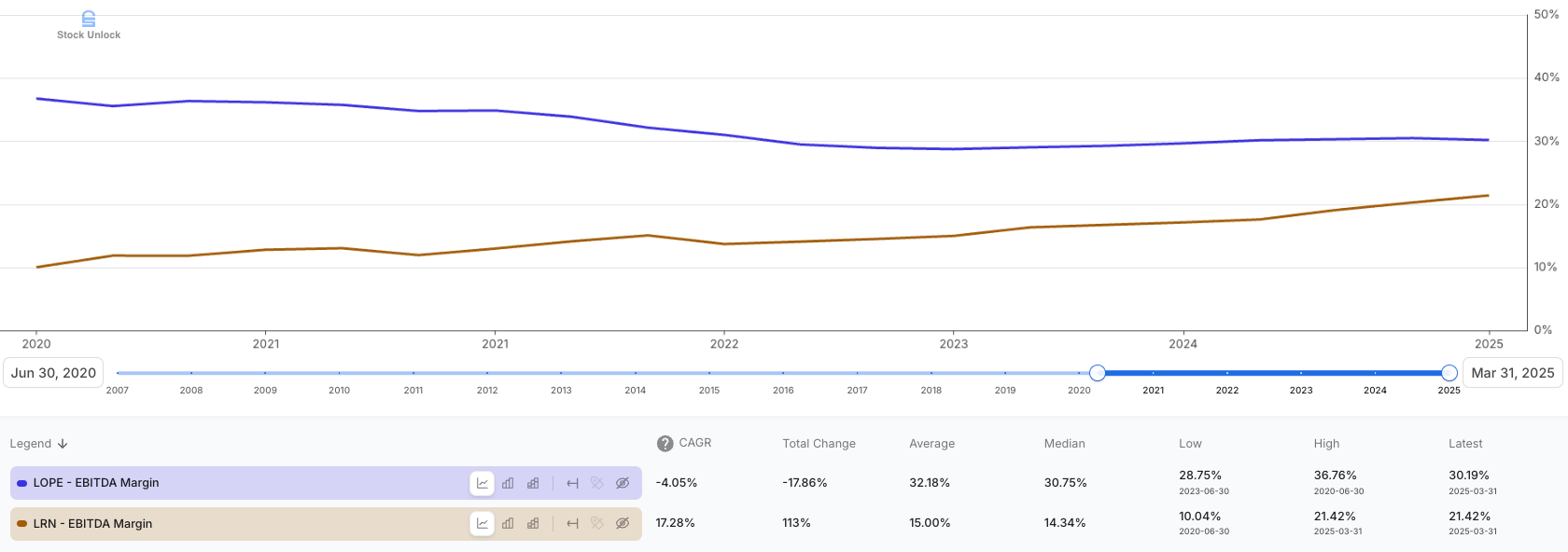 LOPE is an interesting peer — it’s a former university that became a service provider. It runs Grand Canyon University (nonprofit) but provides services for it and other colleges. So it’s more in the OPM (online program manager) space for higher ed. Growth is moderate (~8%) and margins are high; LOPE trades at 24x earnings. While not a direct competitor, LOPE shows how profitable education services can be when scaled. Stride’s margin profile is approaching LOPE’s, but Stride has higher top-line growth. LOPE doesn’t do K-12 at all.
