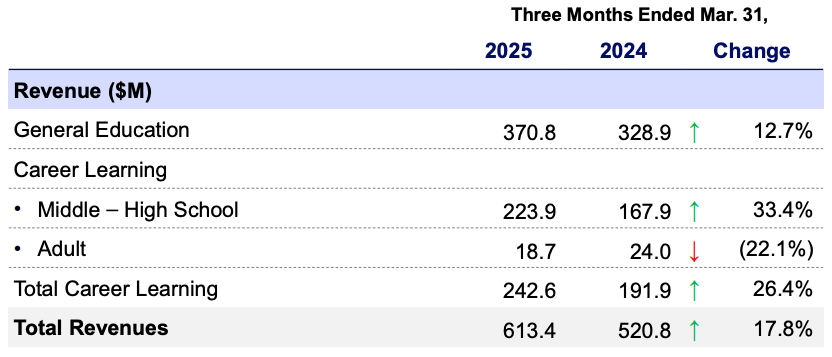 Through these brands, Stride offers short-term skill training programs for adult learners, both direct-to-consumer and via employer partnerships. Together, the K-12 career programs and adult training make up the Career Learning segment. It’s been growing rapidly — Career Learning revenue jumped 26% y/y in Q3 FY2025 (to $242.6M for the quarter) — and now accounts for ~37–40% of Stride’s total revenue.