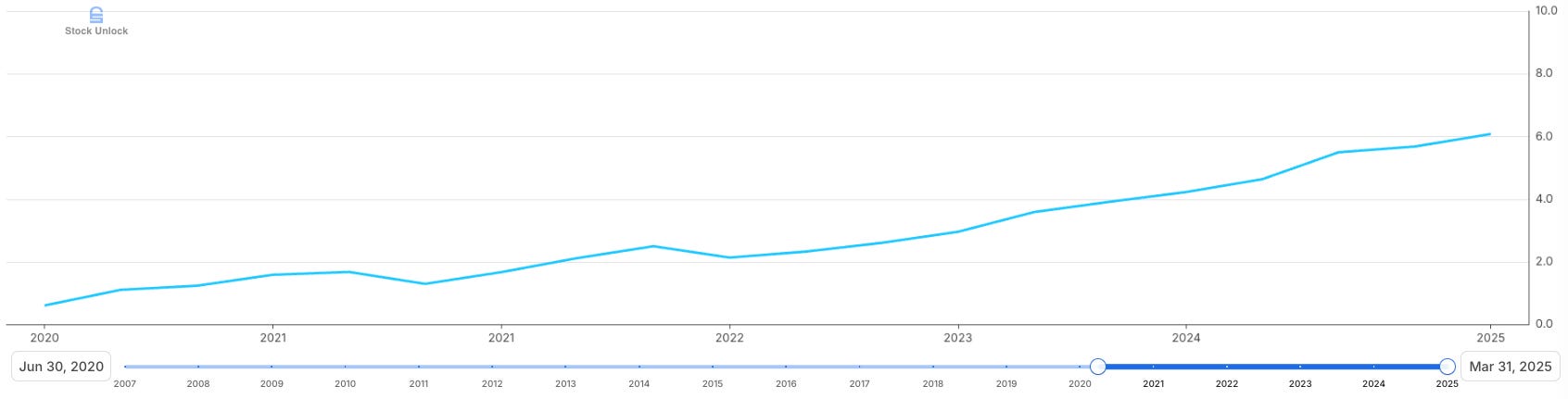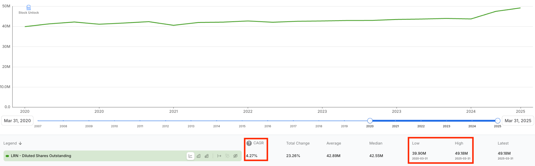 One under-the-radar but important risk: Stride’s share count has been rising. Over the past five years, diluted shares outstanding have grown at a 4.3% annualized rate, increasing from ~39.9M to ~49.2M shares. That’s a 23% total dilution, which does impact per-share metrics like EPS and FCF/share.