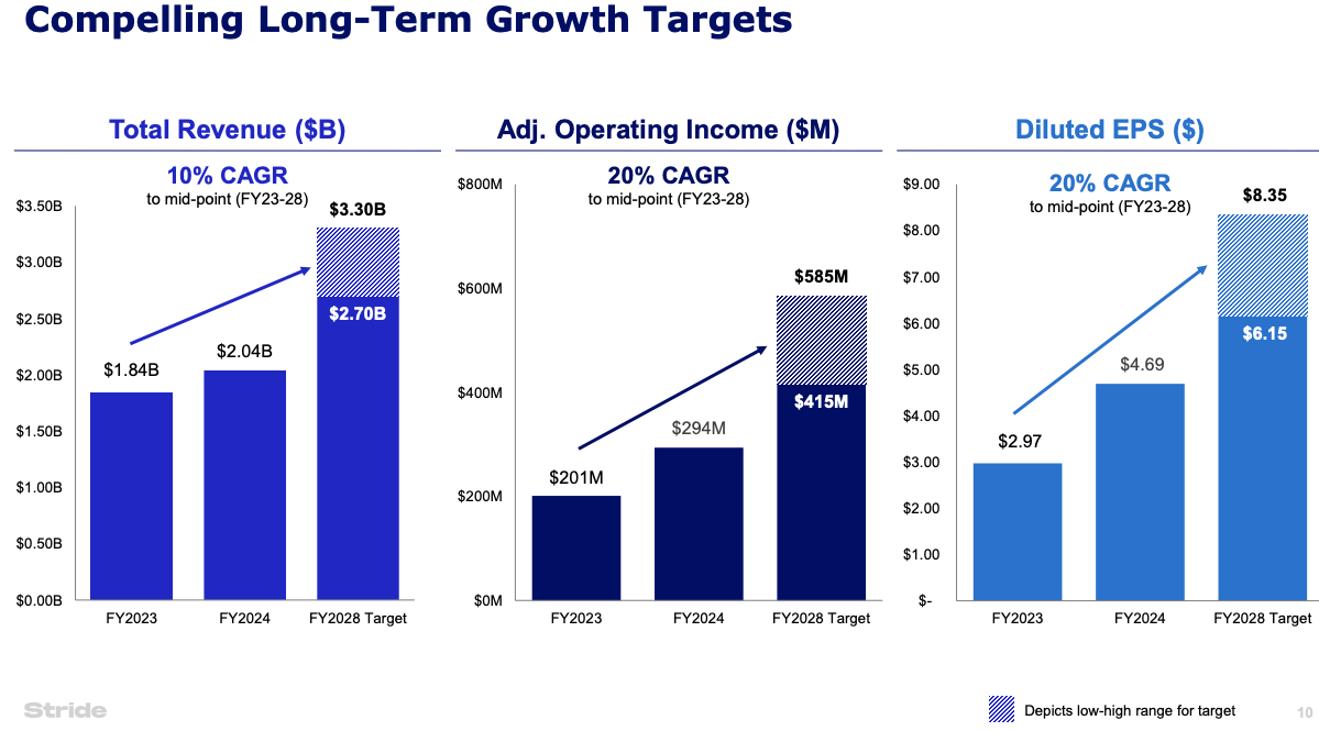 Free cash flow is strong (>$200M annually) and management’s five-year targets imply substantial upside by FY2028. In short, Stride offers a rare combination of secular growth, improving profitability, and a still-underappreciated business model in the massive education market.