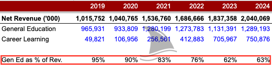 Historically, General Ed was the vast majority of Stride’s revenue (and indeed the company’s original name “K12 Inc.” reflects that focus). As recently as FY2018–2019, Career Learning (then mostly nascent) was only ~5% of revenue. But the mix has shifted rapidly: