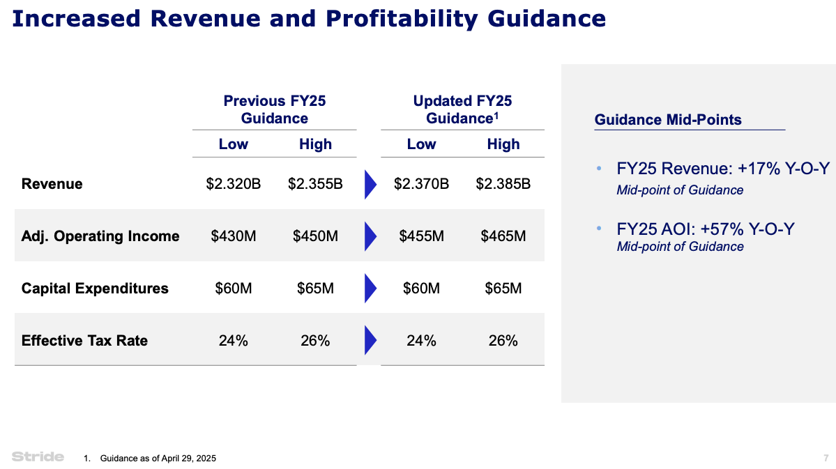 For perspective, overall K-12 public school enrollment is declining (2.5% drop since 2019), so Stride is clearly gaining share in a shrinking market — a testament to the secular shift to online and the company’s execution.