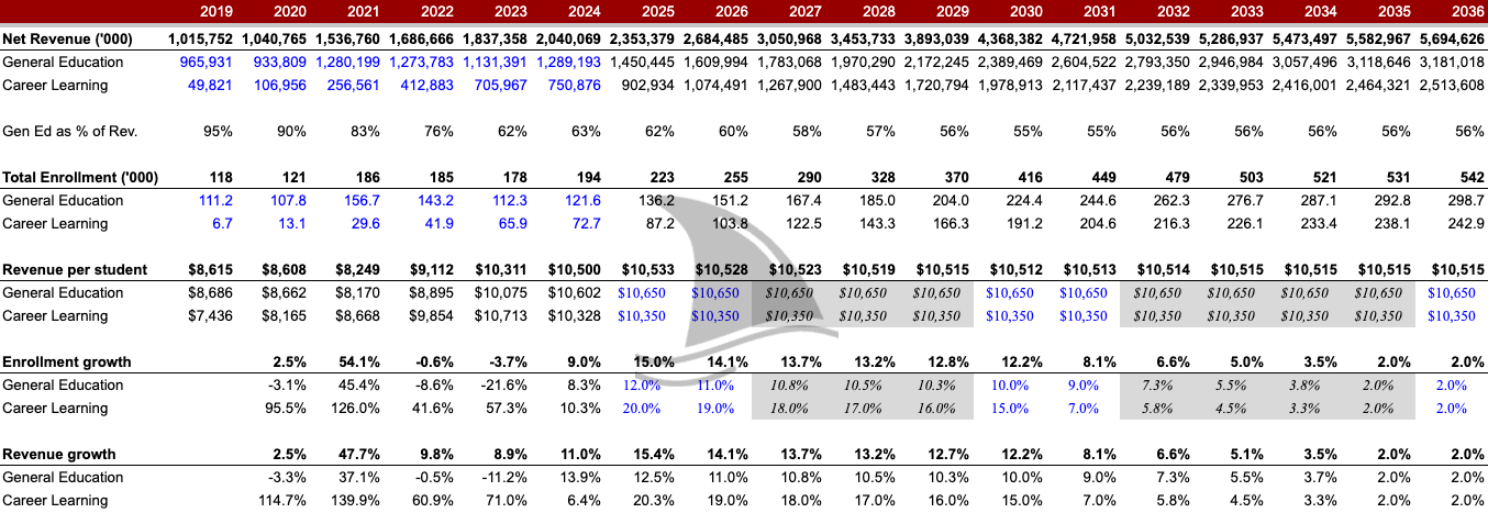 Even more conservatively, 5% penetration of high schoolers would imply ~$6.8B TAM for Stride’s career K-12 programs. In other words, Stride has tapped only a single-digit percentage of its K-12 career education opportunity. And that’s within the U.S. alone; Stride could eventually offer similar programs internationally (it already reaches students in 100+ countries with various products).