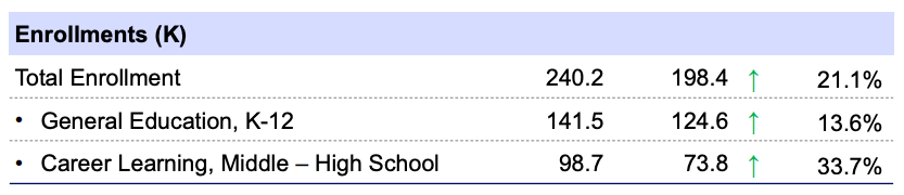 In Career Learning’s K-12 programs, funding also comes via public education dollars when those career courses are part of a student’s school program. Stride noted an average of ~$2,269 revenue per Career Learning enrollment in recent quarters.