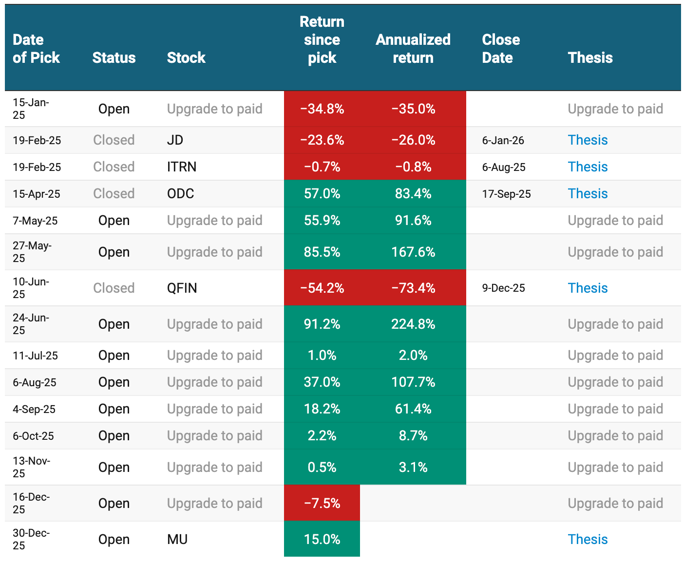 Since launching this newsletter, I have shared 15 stock picks, their track record is below: