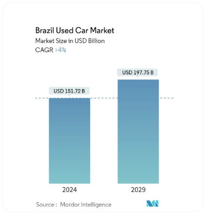 The used car market in Brazil is substantial, with an estimated size of $152 billion in 2024, projected to reach $198 billion by 2029, growing at a CAGR of over 4%.