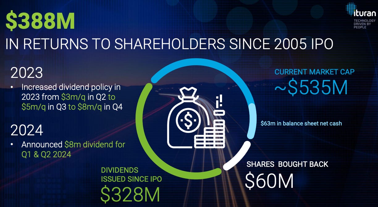 ITRN maintains a strong financial position, with virtually no debt and a solid cash reserve of approximately $63 million as of Q2 2024, providing it with significant financial flexibility. This stability enables the company to consistently return value to shareholders. It currently offers a dividend yield of around 6%, with its quarterly dividend payout increasing to $8 million, a 60% year-over-year rise. Additionally, ITRN continues to execute share repurchase programs, effectively reducing its diluted share count and further enhancing shareholder value.