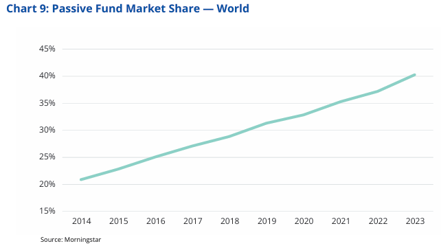 The trend appears to be one-way: passive market share keeps rising. Globally, the share of passive fund assets climbed from roughly 20% in 2014 to 40% in 2023.