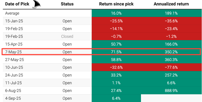 The stock pick I shared on May 7, 2025, is now up about 72% since I wrote about it.