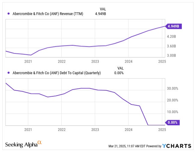 So, I finally pulled the ripcord on my Abercrombie & Fitch ( ANF 0.00%↑ ) position. It’s been a rollercoaster, but let’s start with why I bought it in the first place. Essentially, I saw Abercrombie & Fitch scoring an impressive turnaround in sales and profit margins—they had steady revenue growth, minimal debt, and an upscale brand pivot that seemed legit.